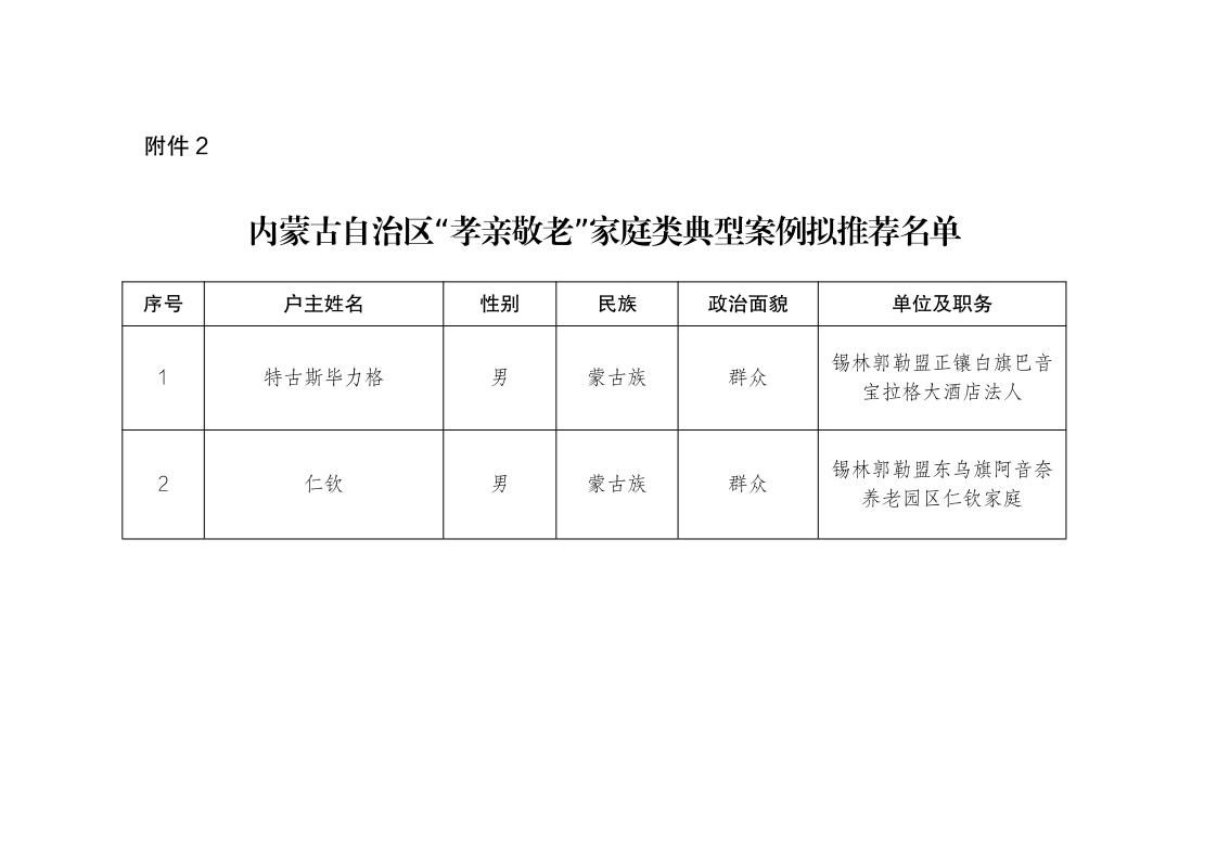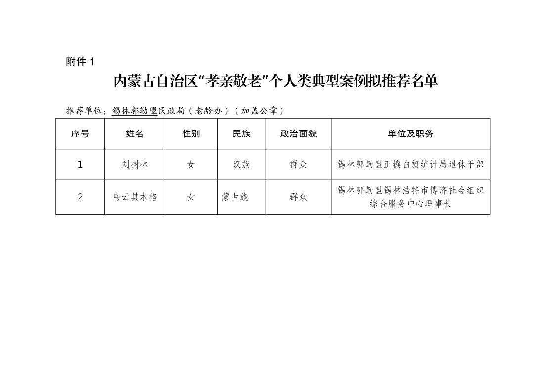(老龄办)初审,盟老龄办复审,现对拟推荐名单予以公示,其中个人典型案例2个、集体典型案例2个和家庭典型案例2个(推荐名单附后)。